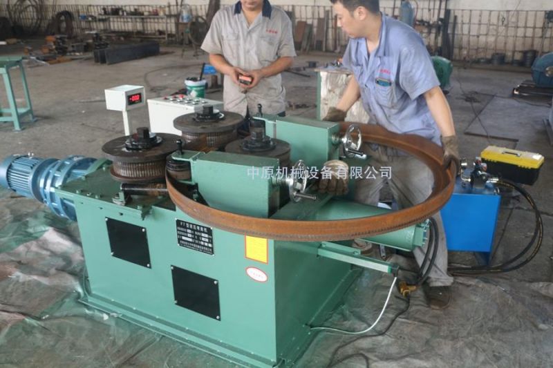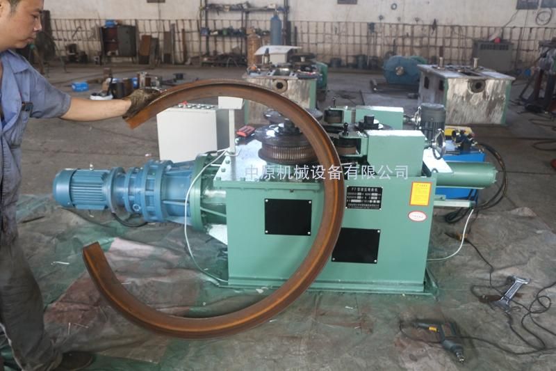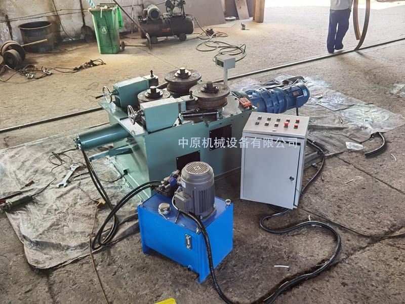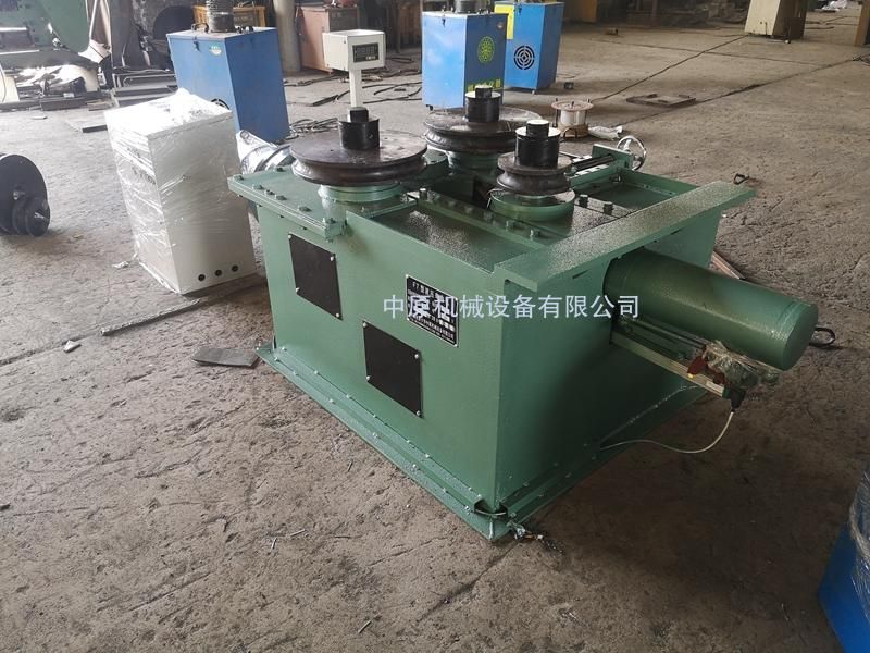 設(shè)備噪音:﹤50分貝4、環(huán)境溫度:-30℃—60℃5、設(shè)備外形尺寸:2800*1200*1000(長,寬,高)三、設(shè)備主要配置(部分構(gòu)件、材質(zhì)、配件、電機(jī)、電器生產(chǎn)廠家)1、 主機(jī)箱體:鋼板焊接件(加固型)2、 成型套模:45*鋼,淬火硬度HRC50—533、 動(dòng)力系統(tǒng):電機(jī):4---5.5kw,減速機(jī)為BLED3-187.液壓泵站電機(jī)4kw,油箱容積50升,額定壓力25mpa。4、電控箱電器:均采用德力西產(chǎn)品,可移動(dòng)電控箱。5 設(shè)備箱體內(nèi)部傳動(dòng)均采用圓柱齒輪。四、設(shè)備原理與特點(diǎn)該機(jī)為叁輥型材卷圓機(jī),集機(jī)電一體。電機(jī)輸出的較高轉(zhuǎn)速通過傳動(dòng)裝置(聯(lián)軸器,減速機(jī),齒輪等)轉(zhuǎn)換成所需的大扭矩低轉(zhuǎn)速,帶動(dòng)固定位置的兩主動(dòng)輥實(shí)現(xiàn)旋轉(zhuǎn)運(yùn)動(dòng),為型材行走提供扭矩。被動(dòng)輥通過油缸前進(jìn)、后退實(shí)現(xiàn)位移,來控制直徑大小。三個(gè)工作輥成等腰三角形分布,通過調(diào)整移動(dòng)輥實(shí)現(xiàn)這三個(gè)點(diǎn)形成的弧線達(dá)到所需彎曲半徑,借助被動(dòng)輥的壓緊及兩主動(dòng)輥的旋轉(zhuǎn)運(yùn)動(dòng),使型材經(jīng)過多次連續(xù)彎曲,產(chǎn)生永久性塑性變形,用于常溫狀態(tài)下將型材卷制成圓形,弧形等工件。