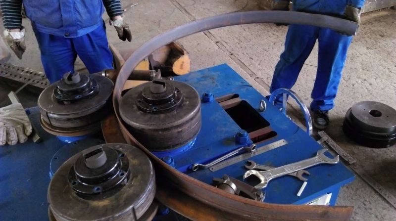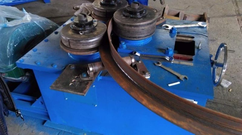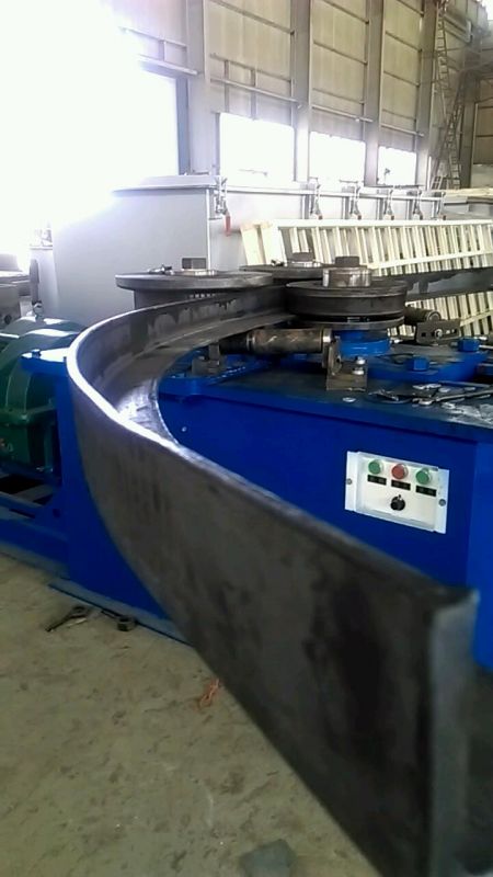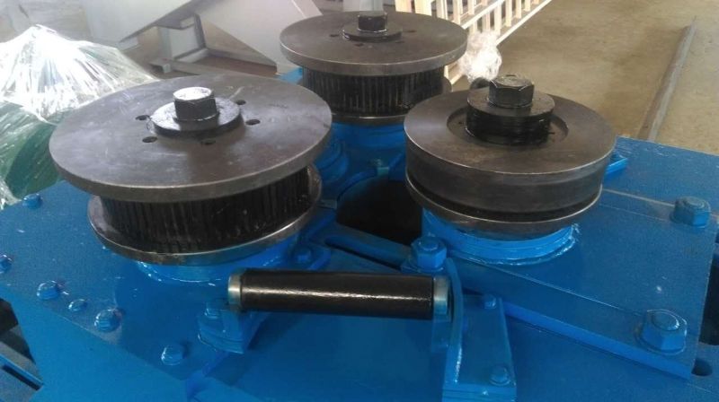 F6型卷圓機是對稱式三輥型材卷圓機,集機電一體,將電動機輸出的較高轉(zhuǎn)速通過傳動裝置、聯(lián)軸器、減速機、齒輪等轉(zhuǎn)換為所需的大轉(zhuǎn)矩低轉(zhuǎn)速,帶動位置固定的兩主動輥實現(xiàn)旋轉(zhuǎn)運動,為型材行走提供扭矩。被動輥通過手輪前進、后退實現(xiàn)位移,為卷制型材提供所需的加壓力,位移量由數(shù)字標(biāo)尺實時顯示。三個工作輥成等腰三角形分布,通過移動被動輥位置實現(xiàn)這三個點形成的弧線達到所需彎曲半徑,即調(diào)整所彎型材的曲率。借助被動輥的壓緊及兩主動輥的旋轉(zhuǎn)運動,使型材經(jīng)過多道次連續(xù)彎曲,產(chǎn)生永久性的塑性變形,用于常溫狀態(tài)下將型材卷制成圓形、弧形、螺旋形等工件。